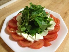トマトにモッツァレラチーズを載せて、その上にバジルではなく、我が家で採れたルッコラを載せてみたした‼