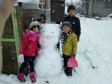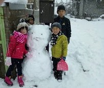 近所のお兄ちゃん、お姉ちゃんに手伝ってもらい、雪だるま完成!!
