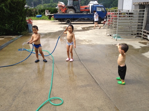 子供たちは夏休みに入って、毎日退屈してます。で、なぜかアグリに来てパンツ一丁になり、水浴び始めました(・_・; 羨ましい…