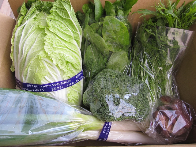 以上の中から、厳選してみなさまにお届けします。 (写真は6品:白菜、ホウレン草、水菜、ブロッコリー、白ネギ、原木椎茸) 料金が6品1,500円、4品1,000円(送料は別途請求)になりまいた!! ご注文お待ちしています。
